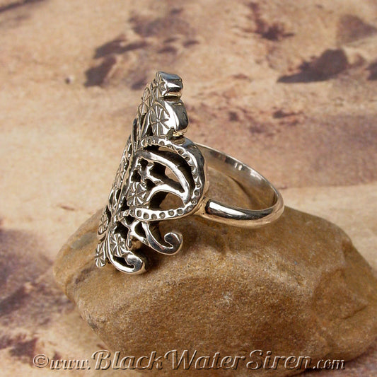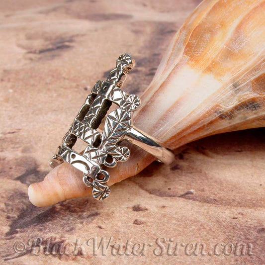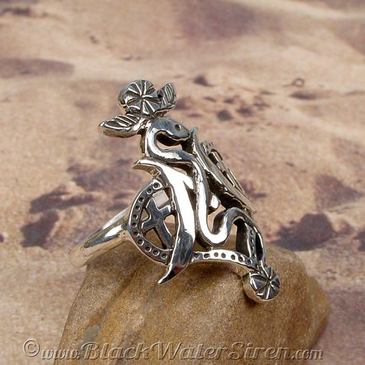 Beautifully and intricately detailed, the Black Water Siren Studio exclusive Veve Ring is completely hand carved then cast in solid sterling silver, 10K or 14K gold. Then a ring band is added in your size, and the piece is polished to a high shine.